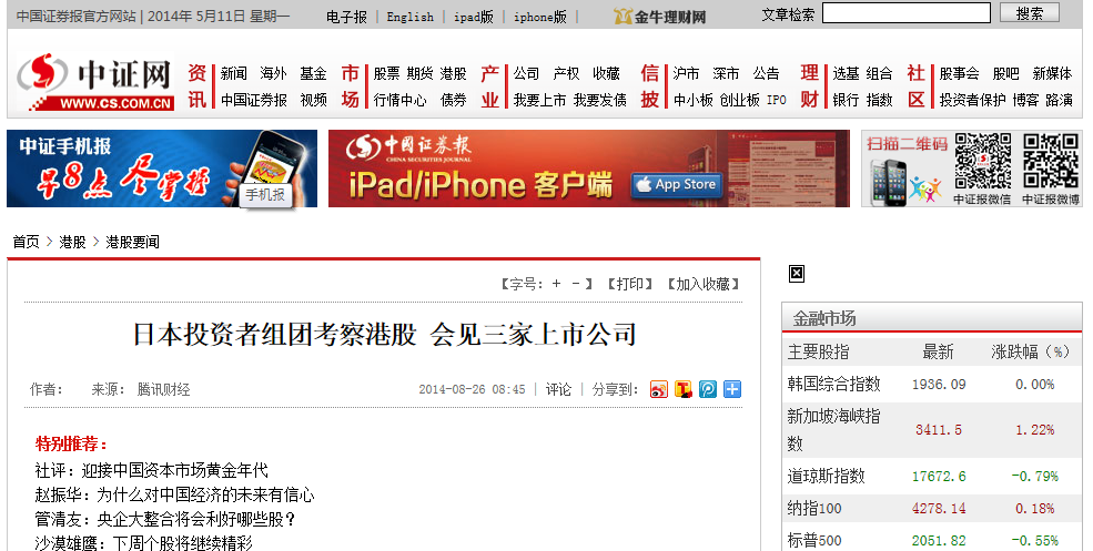 巻頭写真は当社「京華投資視察団」を報じた香港地元新聞の記事を取り上げた中国証券報傘下の中国証券網のポータルサイトのキャプチャ。